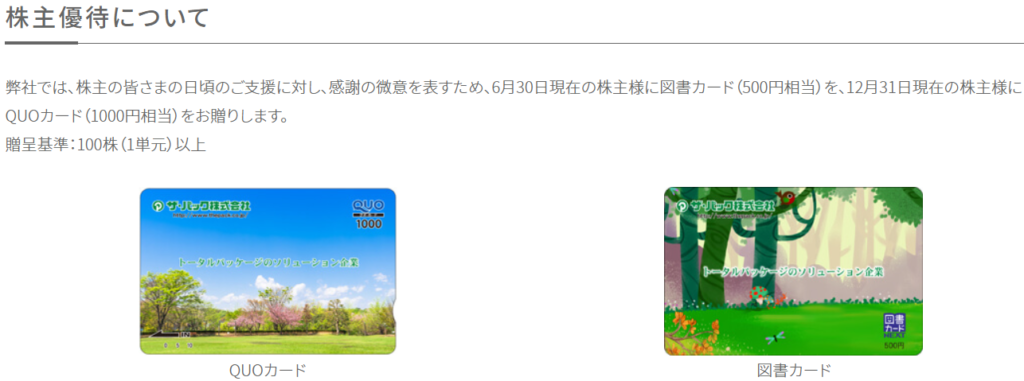 ザ・パックの株主優待は6月に100株保有していれば『500円分の図書カード』、12月に100株保有していれば『1000円分のクオカード』がもらえます。
