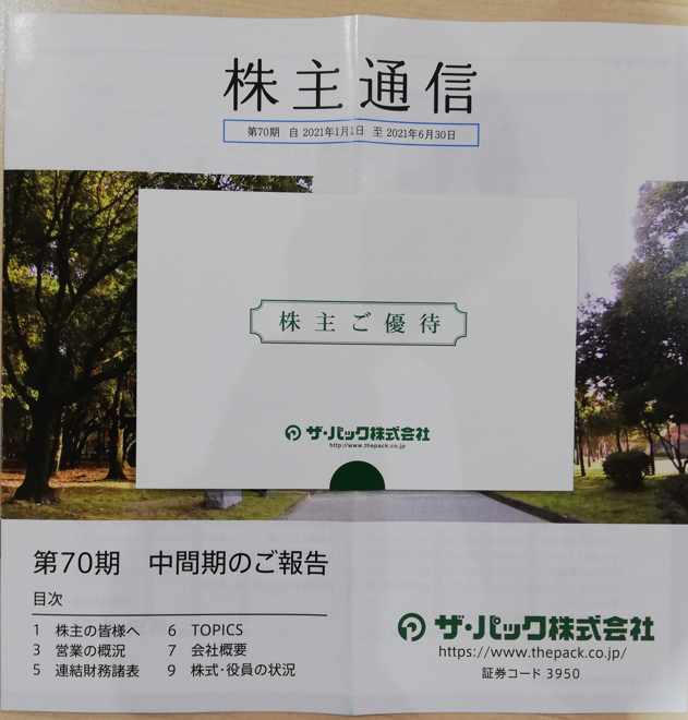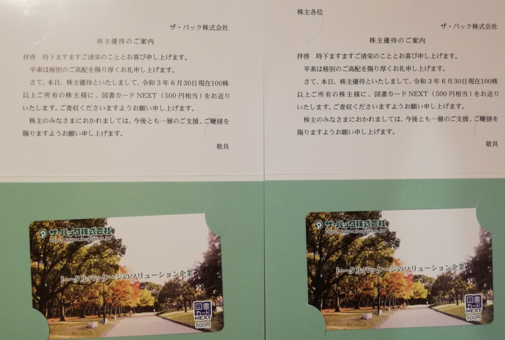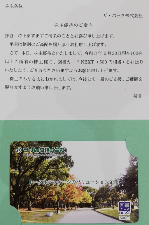 2021年9月某日、『㈱ザ・パック(証券コード:3950)』 から株主優待が届きました☆彡なんと、500円分の図書カード!!